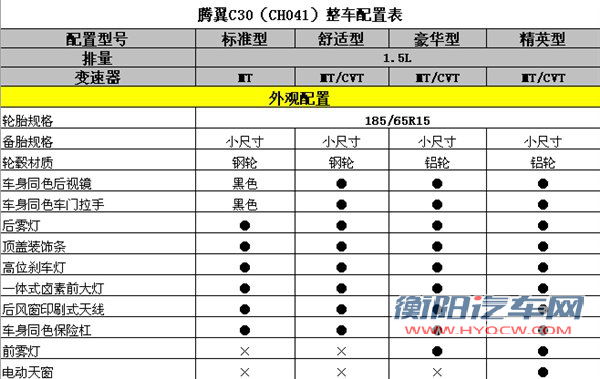 腾翼C30全系都采用了185/65 R15的轮胎,而在其定位的A级车市场上,采用195、205mm胎宽与R16轮毂的车型比比皆是,不得不说在轮胎规格上C30确实显得缺少竞争力。其他的外观配置则是中规中矩,车身同色保险杠,高位刹车灯,一体式前大灯以及后雾灯的配置都是现在紧凑级轿车必不可少的。