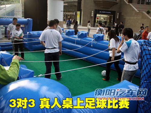 除了电子游戏,球迷亲自上阵搏杀的项目也不占少数,其中参与人数最多的就是考验脚法的射门比赛。不过笔者在现场发现,不少参加游戏的消费者的鞋并不合格这项活动,由于场地限制,射门人员不能大力射门(后面有行人和店面),只能采取戳球的方式,但是大部分参与者的鞋底较厚,脚面和球底部的接触面积较小;另外不少参与者穿的是仔裤,紧身的设计影响了小腿的摆动幅度,因此踢出的球大都是平射出去的。