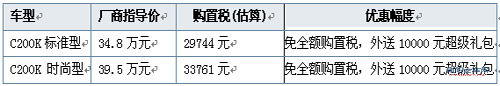 据笔者从市场了解到,自2010年4月1日至2010年6月31日期间,消费者购买梅赛德斯-奔驰C 200 K标准型或C 200 K时尚型车型,可尽享梅赛德斯-奔驰授权经销商赠送全额购置税的优惠措施,与此同时,还可获赠价值一万元的超值礼包。