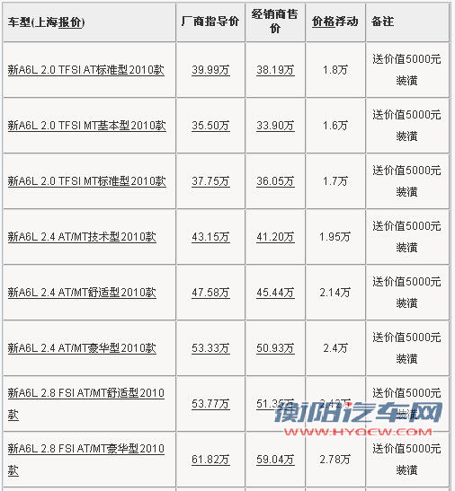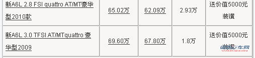 奥迪A6L 08年型新增了一些高科技、人性化配置,将国产高档豪华商务轿车尊贵和科技的基准提升到了一个更高的层面,为用户带来了更高的价值,并再次诠释了一汽-大众奥迪品牌“尊贵、动感、进取”的品牌价值。根据车市价格监测系统显示,奥迪A6L具体车型售价见下表: