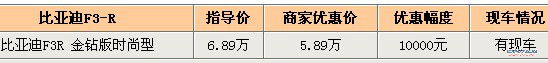 近日,笔者从比亚迪长沙A3销售网4S店了解到,比亚迪F3-R时尚版可以优惠1万现金,而且有现车哦。感兴趣的朋友不妨到店深谈,争取更多优惠。下表是笔者采集的关于比亚迪F-R的具体价格和优惠信息: