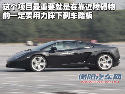 在经历了转向过度操控练习之后,接着进行的是紧急制动避险练习,这个应该是很多试驾会都会体验的项目,只不过兰博基尼的项目设置略有不同。先是加速至70Km左右面对障碍物全力制动后打方向躲避障碍物,接着的动作则是制动停车,这与一般的试驾会有所不同。
