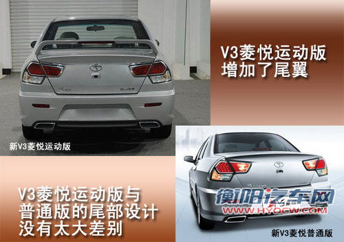 东南新V3菱悦运动版的尾部变化与普通版相比最小,尾灯、雾灯以及双排气管的设计都没有变化。但新V3菱悦运动版增加了运动型尾翼,给尾部增添增加了很多运动气质,而且运动版车型的高位刹车灯也设计在新增的尾翼上面。