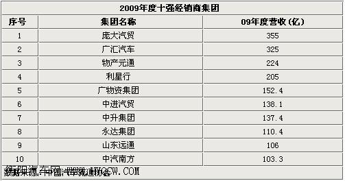 在海外市场很多豪车品牌的代理权都在拥有实力的大财团手中,现在的国内汽车市场这样的趋势也日益明显,根据中国汽车流通协会数据显示,在09年的十强经销商中,庞大集团、广汇汽车的营业收入均超过了300亿元,分别为355亿和325亿。其余经销商营业收入也都超过100亿元,十大经销商营业收入合计达1855亿,可以说部分大经销商无论是销量还是营收都已经超越了部分汽车厂商。