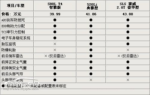 三款车均属于国产顶级的豪华商务轿车,但是在舒适配置上则各有千秋。新SLS赛威在整体配置上十分丰富,并且搭载了三款车中独有的“安吉星Onstar” 车载信息通信服务系统,可以连接专属的客服中心为车主提供6大类14项尊崇服务。宝马520Li在娱乐配置上仅次于新SLS赛威。在这部份对比中我们为您提供的也仅仅是售价在“40万元”附近的车款,如果您想节约开支或是拥有更多预算则可以考虑它们各自的其它车款。