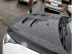 汽车正面最勾魂的就是引擎盖和轮毂的改装。引擎盖是来自国内FCR打孔碳纤维引擎盖,价格为2600元,不算贵,气场不错,但是面对像采访当日下雨的天气,雨水可能要通过打孔处滴到发动机上了。