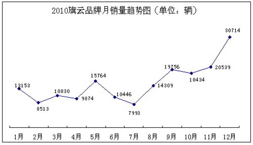 自2010年5月全新整合上市以来,旗云品牌一路高歌猛进,销量接连攀升。“金九银十”的销售旺季,旗云品牌月销均接近两万辆,位居轿车销量榜前列,领跑自主品牌;11月销量突破两万大关,从而使得旗云产品累计销量超过了90万辆,开始向“百万辆俱乐部”进军;12月,更是全面突破了三万辆。骄人的销售业绩,正是源于旗云系列产品卓越的空间、节油、性价优势,旗云1、2、3三款产品已经成为所在细分市场的标杆,在消费者中建立了不俗的口碑。除此之外,旗云品牌还不断开展体验营销活动,其“美好生活创造者”的品牌口号日益深入人心,有力提升了旗云品牌形象。