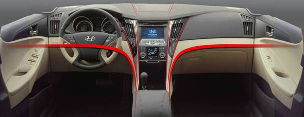 第八代索纳塔内部造型年轻、都市、现代,面向未来的高级内部设计营造出硬朗、运动的内部形象。“流体雕塑”设计理念的中控面板,动感的Y形中控台赋予内饰以动感、硬朗;‘X’造型与外观的动感设计和谐统一,潜水镜式仪表盘动感,可视性强;蓝光照明彰显其高科技和高级感;流体线条式的车门饰板前卫、动感;三片式大型全景天窗则让驾驶者尽享自然和谐。
