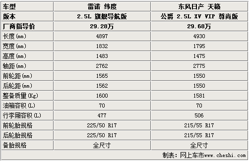 从以上的表格可以看出两款车的车身参数相差不多。整车长度方面雷诺纬度长出了67mm,占据了微弱的优势,完全不会受到影响整体空间。不过在两车的轴距方面东风日产天籁有明显的优势,两款车的轴距都在2750mm以上,这意味着两车的内部空间均可以满足消费者的需求。后备箱的容积两款车也相差不多。