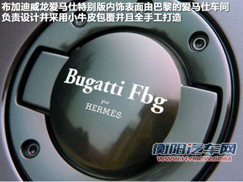该车内饰表面由巴黎的爱马仕车间负责设计并采用小牛皮包覆,全手工打造。方向盘皮革的缝制就需要一个工匠花费十几个小时,因此爱马仕一个月只能生产一辆车的内饰,所以这款特别版一个月也只有一辆的产能。这款跑车的参数同样是追求极致的,最高可达407公里/小时的时速、4个涡轮增压器把汽油压入含有64个阀门的16缸“W”型发动机,最大可达736Kw/6000rpm的输出功率、8公升的排气量,在2200-5500转/分时,最大扭矩可达到1250牛米、从0到100公里的加速时间仅需2.5秒、100-0公里刹车只需2.3秒;时速400公里时,紧急刹车系统会让车在10秒内完全静止。