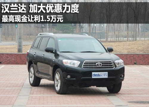 2009年5月25日,广汽丰田汉兰达正式上市销售。此次推出的新车分为2.7L与3.5L两个排量共10款车型,价格区间为24.88-42.98万元。近期,编辑从广汽丰田北京经销商处了解到,汉兰达全系现车销售,购车最高可优惠1.5万元。具体如下: