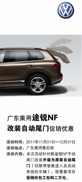 本次活动针对新途锐NF手动尾门改装升级为原装自动尾门(仅限带智能进入及启动系统的车辆),现整套项目促销价包工包料二万元。