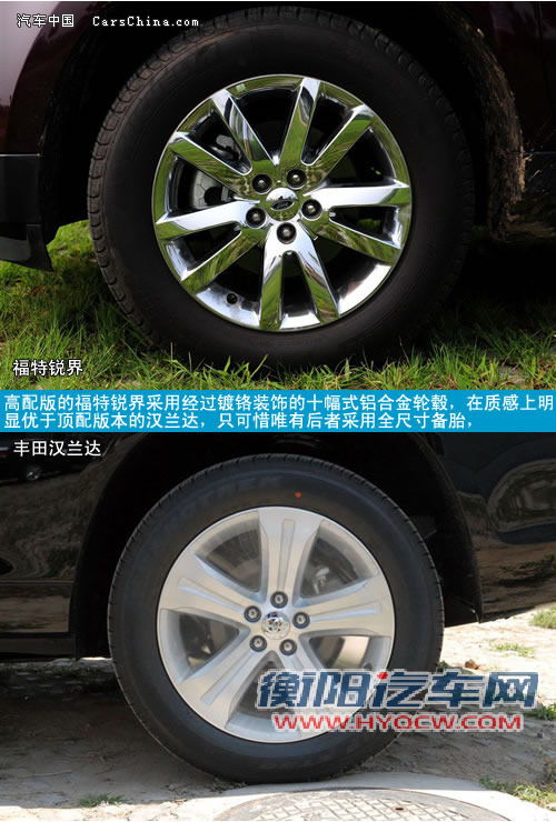 两者作为一款SUV车型,当然要提及它们在这些方面有何区别,首先在四轮配置方面,锐界全系配备了来自米其林的245/60 R18轮胎,而轮毂的样式则根据车型版本而有所区别,非全尺寸备胎的搭配,对于身为进口车的锐界也不要太介怀了。汉兰达由于车型版本较多,轮胎的尺寸也不尽相同,低配车型配备245/65 R17轮胎,高配车型的轮胎尺寸为245/55 R19,令人值得称赞的是,汉兰达全系都配备全尺寸备胎,算是挺厚道的。