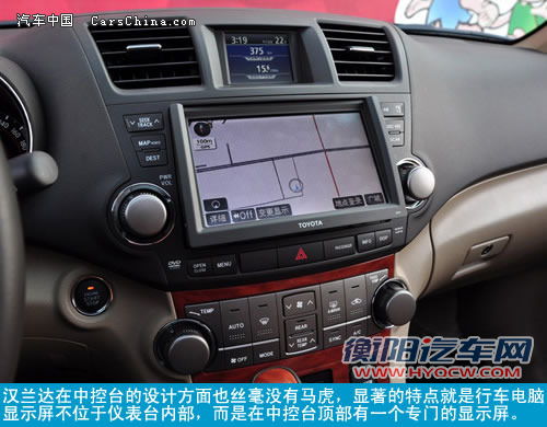 针对高配车型来说,汉兰达在中控台的设计方面也丝毫没有马虎,显著的特点就是行车电脑显示屏不位于仪表台内部,而是在中控台顶部有一个专门的显示屏,面积当然也比一般车型的大了很多,而且还是彩色的,无论是大尺寸的液晶导航屏还是功能众多的空调面板,都很容易上手,可惜,在质感方面,稍逊于进口车身份的福特锐界。