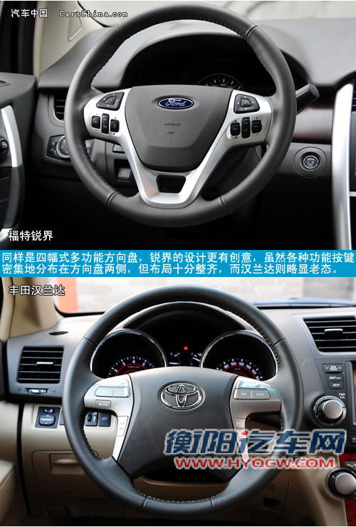 同样是四幅式多功能方向盘,锐界的设计更有创意,虽然各种功能按键密密麻麻地分布在方向盘两侧,但布局十分整齐,在实际的操作中不会感到丝毫的复杂。而汉兰达的方向盘则略显老态,从老款凯美瑞一直沿用至今,大概已有五年的历史,加上被某自主车型高调模仿,目前已经没有吸引力可言。