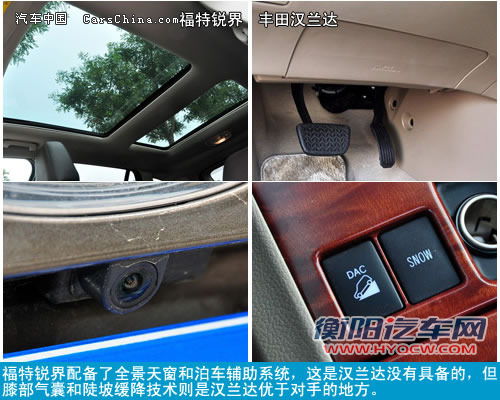 在其他车内配置方面,以高配车型为例,福特锐界配备了全景天窗和泊车辅助系统,这是汉兰达没有具备的,但膝部气囊和陡坡缓降技术则是汉兰达优于对手的地方,两者的差距可谓是各有千秋,应如何选择,就看作为消费者的你看重哪种配置了。