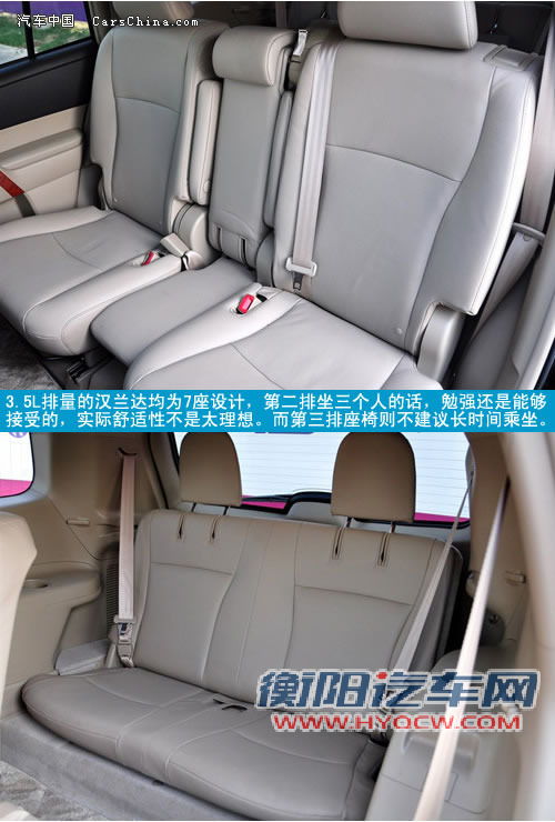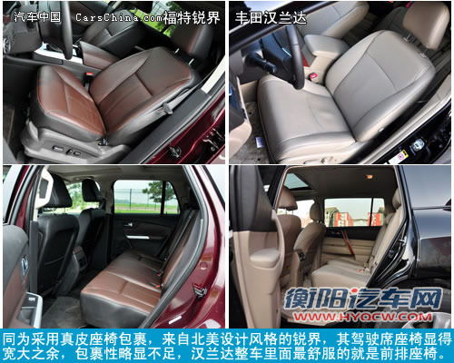 同为采用真皮座椅包裹,但由于来自北美的设计风格,锐界的驾驶席座椅显得宽大之余,包裹性略显不足,加上车身高度有限,头部空间比汉兰达稍逊一筹,特别是配有天窗的车型,更是捉肩见肘。汉兰达整车里面最舒服的就是前排座椅,而且还专门对肩部支撑进行强化,驾驶席座椅除了常规的调节项目之外,还能调节座椅前端的座垫,当达到最高位时对大腿的支撑也同样十分出色。