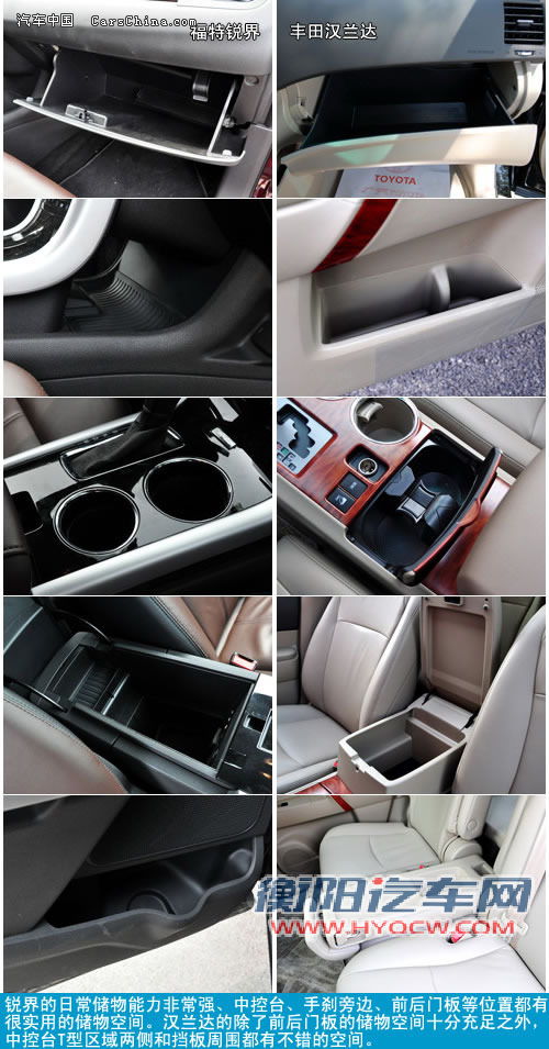 锐界的日常储物能力非常强、中控台、手刹旁边、前后门板等位置都有很实用的储物空间。前排中央扶手内的空间非常大、实用性很强,后排中央扶手上的两个带有限位机构的杯架也非常实用。汉兰达的除了前后门板的储物空间十分充足之外,中控台T型区域两侧和挡板周围都有不错的空间,而且中央扶手箱和副驾驶手套箱内的空间也和汉兰达的身躯一样大,与其大块头的身份非常符合。