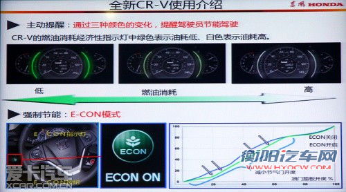 厂家公布的数据显示,全新CR-V 2.0L两驱车型、2.0L四驱车型和2.4L四驱车型的综合工况油耗分别为每百公里8.0L、8.2L和9.0L。全新CR-V还为你提供ECON智能化绿色节能辅助系统,只要按下方向盘左侧的绿色ECON开关,车辆便自动进入优先控制油耗模式。