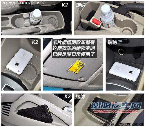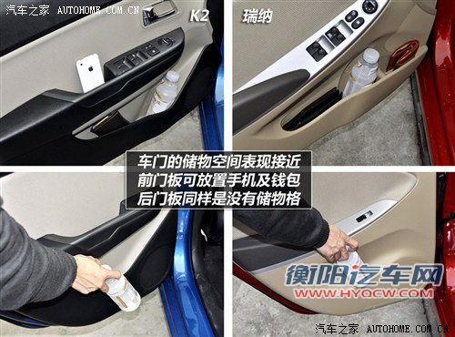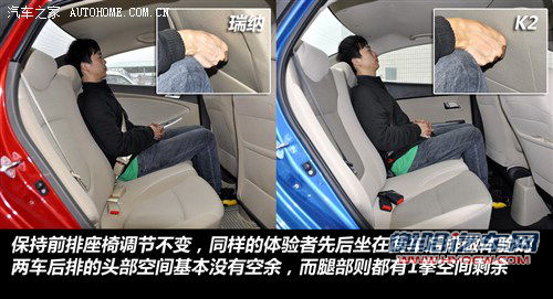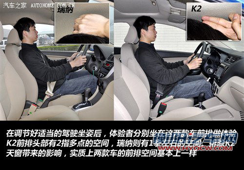 结果:瑞纳的前排头部有1拳左右的空间,而K2则有2指多点的头部空间。排除K2天窗带来的影响,实质上两款车的前排空间基本一致。