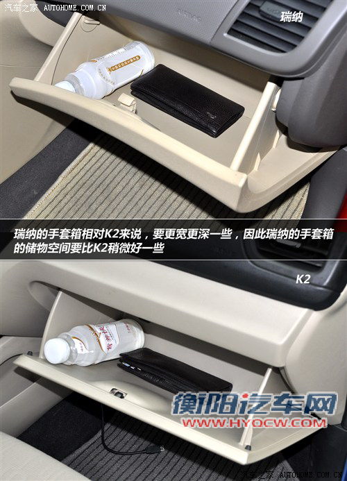 在储物空间方面,首先来看看我们经常使用到的手套箱。从下图可以看到,相同的物品分别放在两车的手套箱时,瑞纳的手套箱要明显宽松一点。