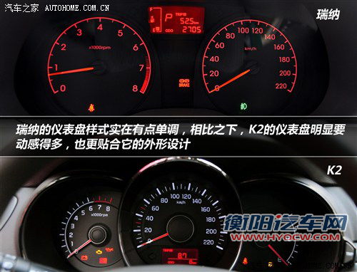 两车的方向盘造型相仿,而且手感也近乎一样。而真皮包裹的多功能方向盘则只会出现在两车中高配车型以上。至于仪表盘方面,我认为K2的表现会好很多,相信也没人反对。瑞纳的仪表盘实在是太单调了,与动感的外形,时尚的内饰设计不太搭调。