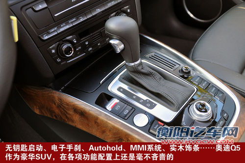 体现了奥迪Q5科技感的地方在于换挡区,这里集中了ESP开关、无钥匙启动、电子驻车以及MMI控制键等众多功能。奥迪Q5的低配车型内部显得比较寒酸,不仅没有多功能方向盘而且诸如MMI系统等功能都被简化,整体档次降低了不少。