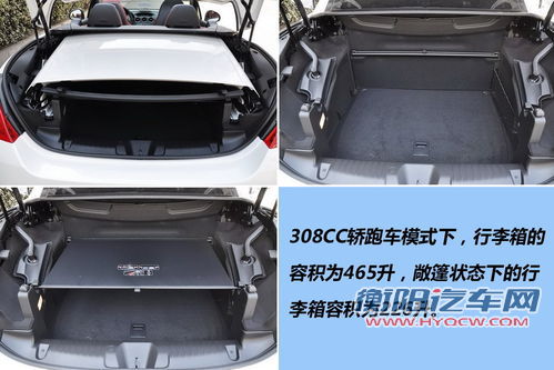 308CC轿跑车模式下,行李箱的容积为465升,敞篷状态下的行李箱容积为226升。