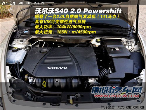 目前在售的S40搭载的是与上一代福特福克斯一样的2.0L自然吸气发动机,带有VIS可变惯性进气系统,但在调校上略有区别,最大功率104kW/6000rpm(141马力),最大扭矩185N·m/4500rpm,必须使用97号汽油。说实在的,这款发动机从参数上来看实在一般,拖动整备质量达1.43吨的S40并不轻松,但好在Powershift6挡双离合变速箱能够弥补经济型上的不足,并且经过多年的市场历练,这款变速箱在可靠性上也有保障。