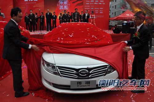 中国汽车报社名城巡展事业部部长、百强巡展系列活动组委会副秘书长谷国全与广汽传祺衡阳铭仕店销售经理何灵星为广汽传祺2011款揭幕