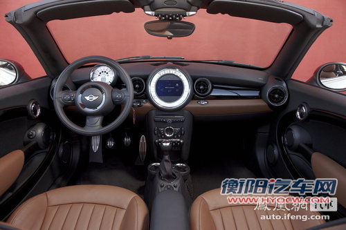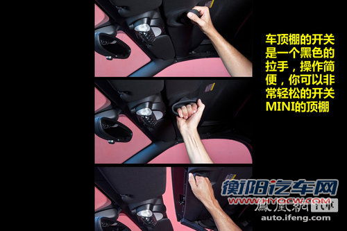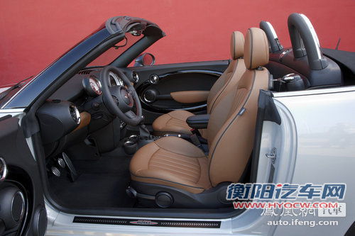 MINI ROADSTER的软质车顶是手动调节的,通过布置在车内的拉手,你可以分成四部完成顶棚的开合工作,虽然不及电动的方便,但是操作起来也还算比较简便的。