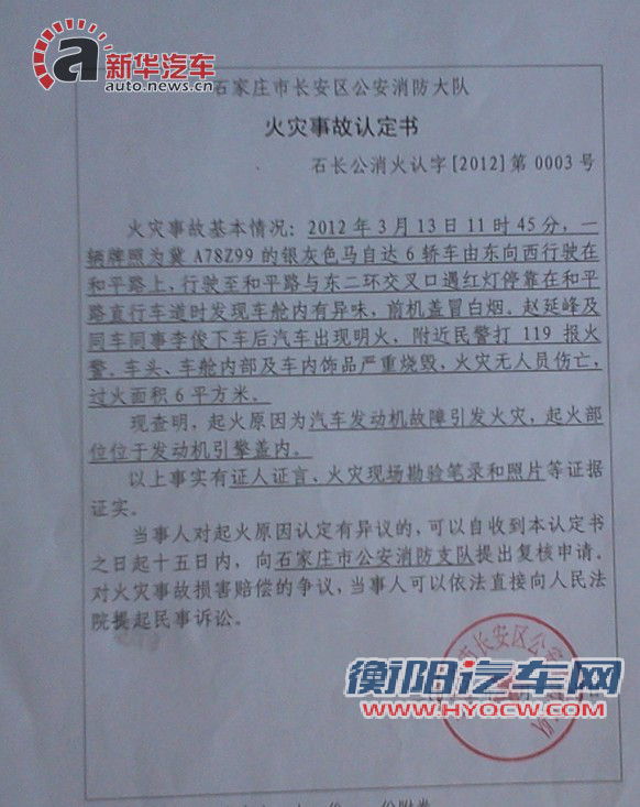 据车主称,“这辆轿车是去年5月份购买的,一直按期保养,截至事发时才跑了不到9千公里。车辆是在正常行驶过程中着的火,这让我很诧异,应该是质量问题。但是更纠结的是,事发将近一个月了,消防部门的鉴定也出来了,厂家的勘察员也对车进行了勘察,可是4S店还是一直没有给明确答复。”车主无奈地说。