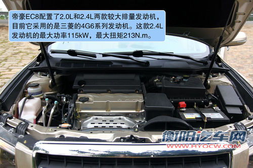 2011款帝豪EC8的2.0L车型配备的是2.0L 136马力直列4缸发动机,最大功率为100千瓦,最大扭矩为180牛米;而2.4L车型搭载的是2.4L 156马力直列4缸发动机,最大功率为115千瓦,最大扭矩为213牛米。其中2.4L车型的发动机动力表现不错,起步反应敏捷,提速时推背感也很明显,不过在高速行驶的时候动力性能一般,发动机的噪音也比较明显。