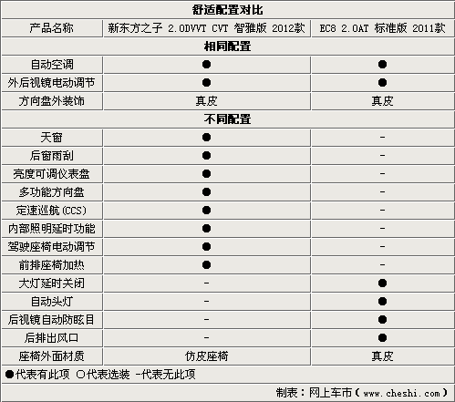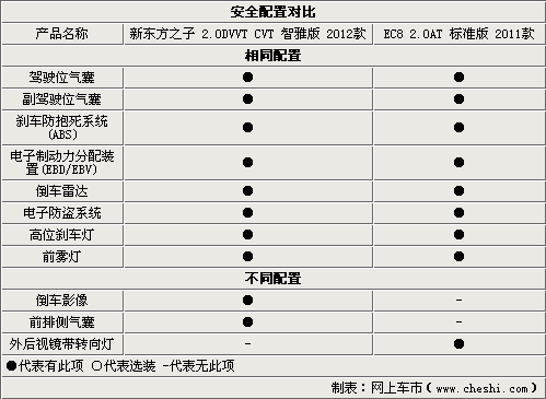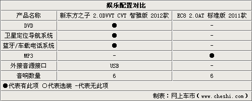 从娱乐配置表中我们非常好看出新东方之子在娱乐配置方面的优势。新东方之子具备导航、DVD、车载蓝牙电话、USB音源接口,这些都是EC8没有的功能。EC8仅能读取CD或者MP3格式CD,局限性还是太大了。