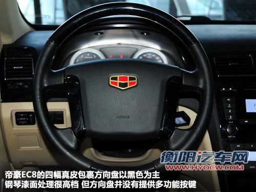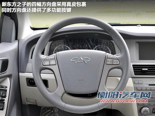 新东方之子四幅方向盘采用真皮包裹,同时方向盘还提供了多功能按键功能。多功能按键集成音响控制、定速巡航、车载蓝牙电话等,基本的操作手不离开方向盘就可实现。帝豪EC8的四幅真皮包裹方向盘以黑色为主,钢琴漆面处理很高档,但方向盘并没有提供多功能按键。
