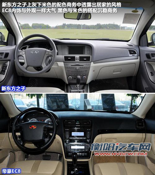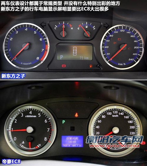 两车仪表设计都属于常规类型,并没有什么过于出彩的地方。新东方之子的行车电脑显示屏明显要比EC8大,而且黑底白字看上去很舒服。帝豪的EC8显示屏过小的显示屏,蓝色的背景光与周围仪表搭配起来总有那么点“山寨”。