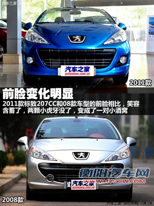 前脸的变化是2011款标致207CC和老车型相比最大的不同,在保留了原有大嘴造型的同时,“脸部”表情比原来变得含蓄很多,嘴没有之前咧的这么大,而且两颗小虎牙(雾灯)没有了,转而变成了脸颊上的小酒窝。