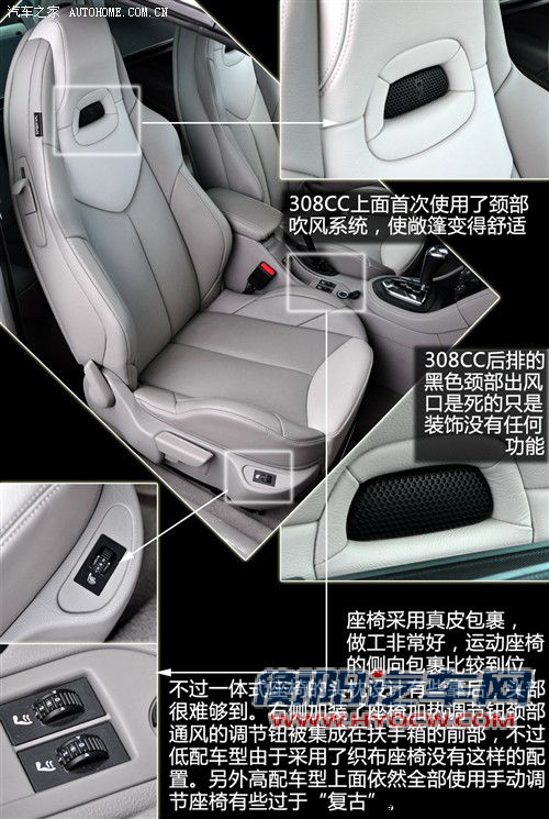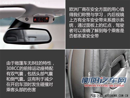 配置上作为30万元左右的进口车,标致308CC不会让人失望,六安全气囊、电子防炫目后视镜、ESP车身稳定系统都是标配,高配车型还带有胎压监测、感应雨刷、大灯清洗、自动氙气头灯几项配置。舒适性功能上,电动真皮座椅、前排电加热也都能够见到。从高低配车型3.4万全的差价来看,内容还是非常丰富的。
