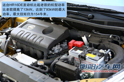 骐达HR16DE全铝制发动机采用了CVTC(连续可变气门正时控制)技术。它可以根据车辆的行驶状态,控制进排气的凸轮轴相位,以保证最佳的点火时间,从而大幅度提高输出扭矩和燃油经济性,油耗比同排量发动机减少20%。其最大功率可实现93kw/5600rpm,峰值扭矩扭矩154Nm/4000rpm,在老款骐达上,相同的动力结构,最大功率是80kw,峰值扭矩为153Nm/4400rpm。