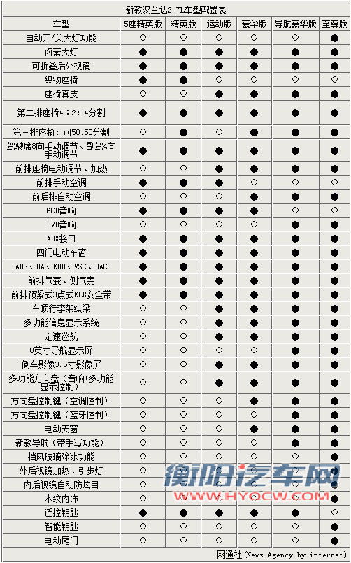 从上表可以看出改款汉兰达2.7L车型全系标配卤素大灯、可折叠后视镜、前排气囊和侧气囊等常规配置,舒适性配置较丰富的车型主要出现在2.7L高配车型当中,包括真皮座椅、电动天窗、前后排自动空调、DVD音响等,不过也出现了像智能钥匙、电动尾门等新增配置,这些新添加的配置使得汉兰达更加人性化。