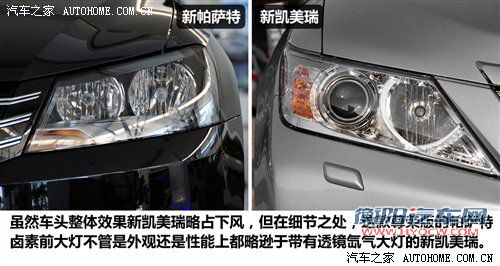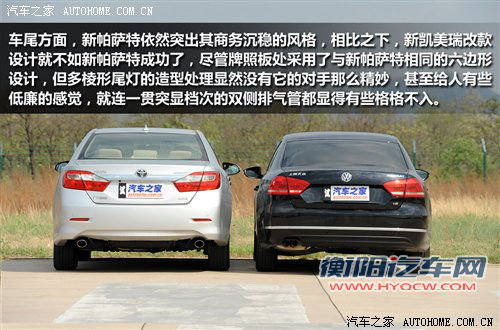 此次参与对比的这款新帕萨车型并未配置家族气质更足的带LED日行灯和透镜的氙气大灯,但不可否认的是,新帕萨特的车头整体造型要比新凯美瑞看上去更显档次,也更适合商务场合;反观新凯美瑞虽然线条很犀利,但是并未给人很时尚的感觉,而且过于运动的感觉使其缺少了一份应有的稳重感。