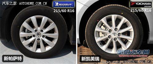 乍一看两车的轮毂造型极为相似,都采用了效果看上去更优雅的16英寸十辐条设计,但相较之下凯美瑞的轮毂造型则更动感一些。相似的轮毂也造就了相同的轮胎尺寸规格,215/60 R16轮胎在这个级别来说只能是入门产品,好在品牌还都不错,都是国际上知名的大牌厂商,而帕萨特采用的米其林轮胎名气更大一些。