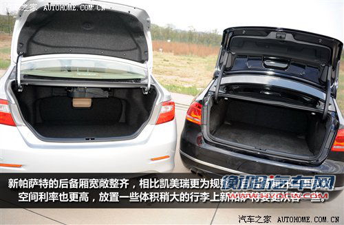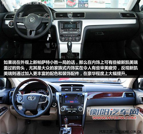 其他配置方面,新帕萨特后排单独调节空调和遥控钥匙锁车升窗功能都是新凯美瑞所不具备的;而氙灯、无钥匙一键启动、带有倒车影像的中控彩色液晶屏等家庭用户更喜欢的配置则是新凯美瑞胜过新帕萨特的地方。安全配置方面,新帕萨特更注重行驶安全方面,加装了胎压监测、上坡辅助以及感应雨刷等行车配置,而凯美瑞在被动安全防护方面则更加到位一些,前后侧气帘以及膝部气囊等高级防护措施一应俱全。总之在内饰和配置这个对比环节上新凯美瑞要比新帕萨特表现的更好一些,尤其对车内乘员的照顾新凯美瑞显然更加贴心。