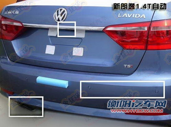 同样,从车尾部分的细节也能区分高低不同配置的版本,高配版车型尾部的双出排气管,以及尾部的“TSI”标牌都表明了其更加强劲的1.4TSI动力,另外比低配版车型多了牌照框上方的后视摄像头和后保险杠上的四个雷达探头。
