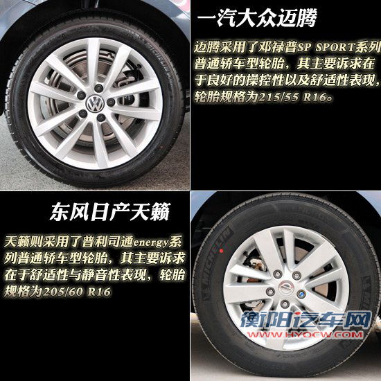 在轮胎方面,迈腾采用了邓禄普SP SPORT系列普通轿车型轮胎,其主要诉求在于良好的操控性以及舒适性表现,轮胎规格为215/55 R16。天籁则采用了普利司通energy系列普通轿车型轮胎,其主要诉求在于舒适性与静音性表现,轮胎规格为205/60 R16。
