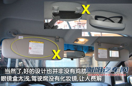当然了,除了一些让人意外的设计和配置之外我也发现了不太让人满意的地方。例如前排遮阳板内侧原本好端端的设计了化妆镜,但是却只有副驾驶一遍才有。再来说说驾驶席一侧车顶上的眼镜盒,太浅的设计确实没办法放下大一点儿的眼镜,如果你恰好想把太阳镜也放在这里,那么你还是断了这个念头吧,因为这完全行不通。