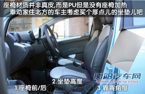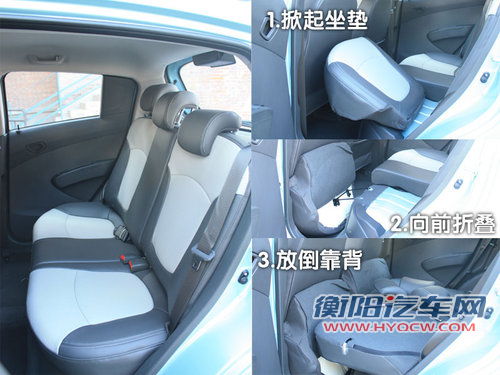Spark分为两款车型,一款是低配的手动挡版本;另一款是高配的自动挡版本。自动挡车型配有皮质座椅,驾驶席座椅可以高低、角度、前后6向调节,对于不同身高、胖瘦的驾驶者都能够找到一个合理的坐姿,但是方向盘的高度和角度无法调节,不太令人满意。后排座椅可以进行4/6比例的拆分折叠,进一步拓展行李箱的空间。在后排座椅上还意外的看到了3只安全头枕,可以说这是目前同价位、同级别车型中极为罕见的设计。