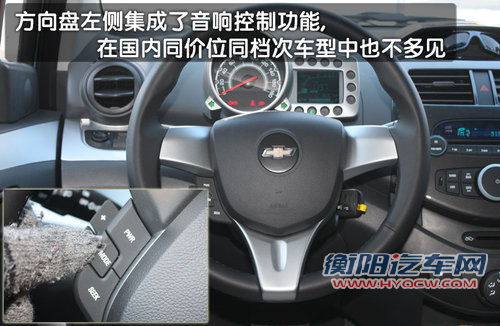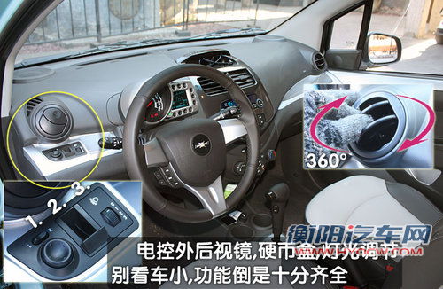 Spark可以说是一款有着大肚量的小车,在车内你可以找到有多达27处的人性化储物空间,能轻松包容Sparker们稀奇古怪的个性物品。中控台左侧电动后视镜与大灯高度调节按钮的出现既简化了驾驶者的操作又提供了额外的安全保证,360°可旋转的空调出风口能够任由乘员调节,在车内形成一个循环空调的气流。