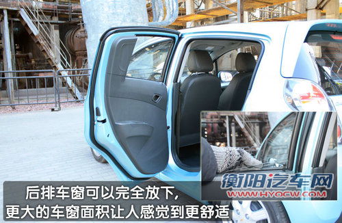 Spark的后门把手是隐藏式的,它就隐藏在了后门车窗的后方远远看过去与黑色的车窗框形成了一体,所以会给人以这是一台两门车的感觉。