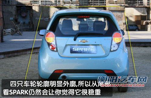我们再回过头来看看车尾的轮廓,设计师在Spark上充分的发挥了想象力,所以我们就在Spark的尾部看到了既大胆又传统的设计。而从功能性和实用性上来说,外扩的宽大线条设计也是为车内最大限度的争取了空间。